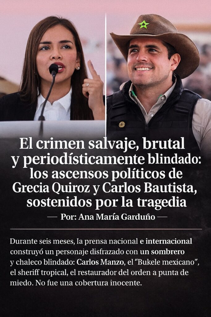 Durante seis meses, la prensa nacional e internacional construyó un personaje disfrazado con un sombrero y chaleco blindado: Carlos Manzo, el “Bukele mexicano”, el sheriff tropical, el restaurador del orden a punta de miedo. No fue una cobertura inocente. Fue una campaña de manufactura mediática donde ciertos grupos políticos, los mismos que incuban pupilos con ADN doctrinario de Calderón, alimentaron la fantasía de que Uruapan necesitaba mano dura, no gobierno; castigo, no justicia; espectáculo, no instituciones. En los altavoces editoriales lo presentaron como el nuevo modelo de autoridad: un líder dispuesto a “limpiar” la ciudad cueste lo que cueste. Y así, la dictadura como estilo de gestión dejó de ser una advertencia y pasó a ser un eslogan. Un laboratorio de control social disfrazado de eficacia.