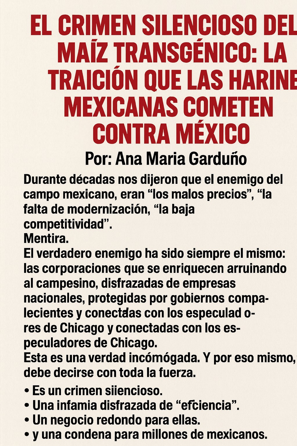 Hoy, mientras México intenta recuperar su soberanía energética, agrícola y alimentaria, las grandes harineras, hoy encabezadas por Altagracia Gómez, dueña del grupo MINSA y sus socios han elegido otro camino: el camino de la traición, ese donde el beneficio económico vale más que la salud del pueblo, más que la vida rural, más que la identidad de un país entero. Esta es una verdad incómoda. Y por eso mismo, debe decirse con toda la fuerza.