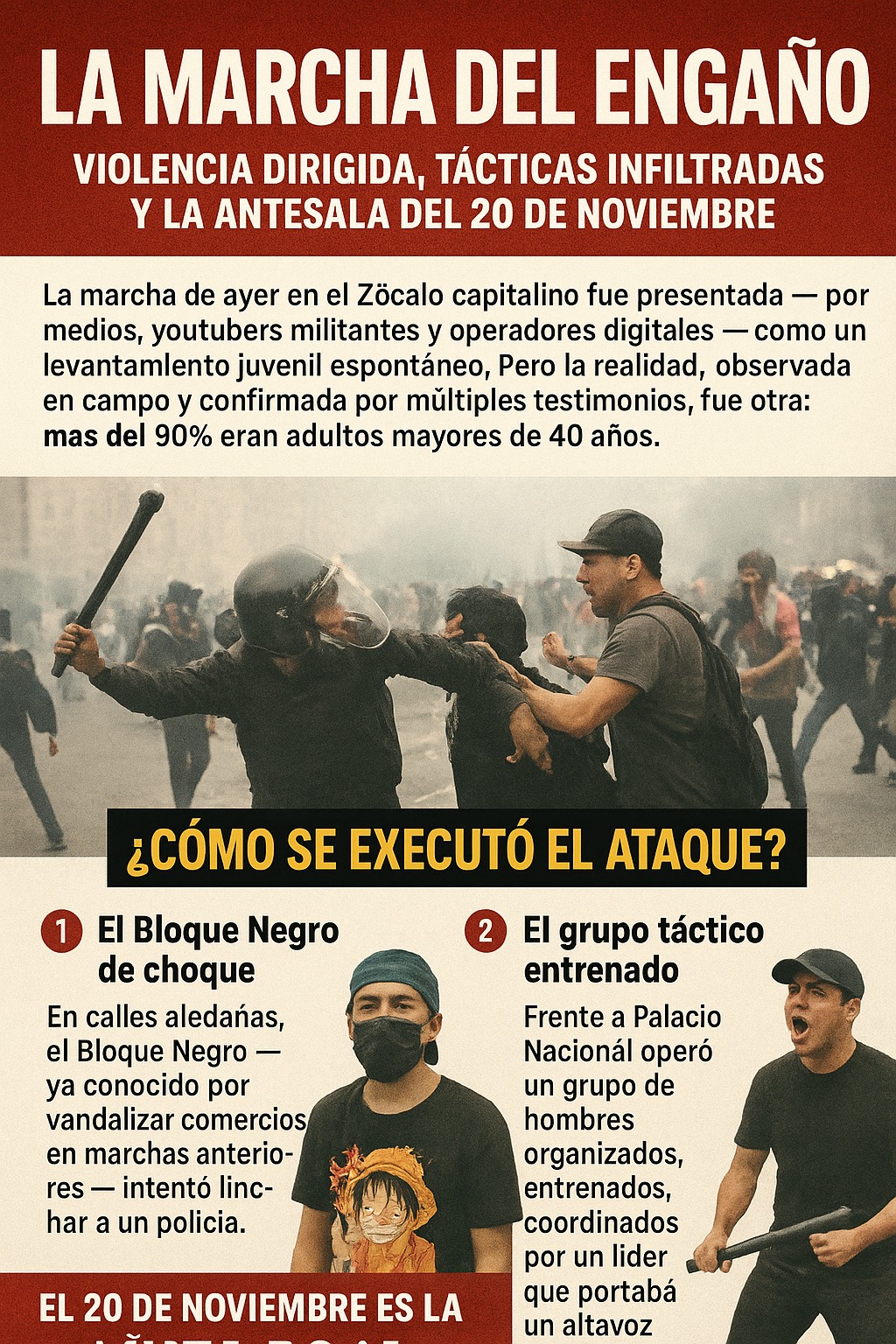 I. La marcha que nació bajo una mentira: La movilización convocada supuestamente por la “Generación Z” para protestar en el Zócalo capitalino no fue, en los hechos, una marcha juvenil. La tarde del 15, en el Zócalo capitalino no estalló una marcha juvenil espontánea, ni una revuelta nacida de TikTok, ni un despertar generacional como la prensa obediente se apresuró a titular. Lo que ocurrió fue otra cosa: un ensayo general del caos, operado por viejas élites políticas extranjeras y nacionales, operadores tácticos y grupos entrenados sumamente violentos y sincronizados que aprovecharon a unos cuantos jóvenes desorientados como decoración narrativa para justificar su violencia.
