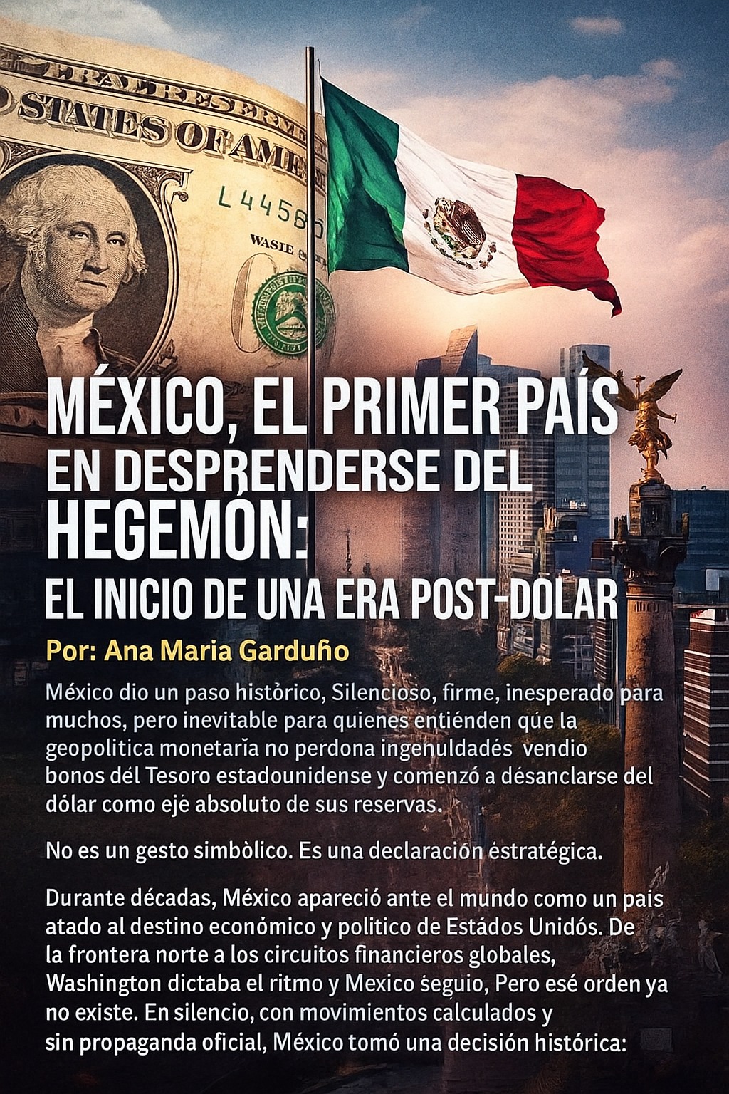 México dio un paso histórico. Silencioso, firme, inesperado para muchos, pero inevitable para quienes entienden que la geopolítica monetaria no perdona ingenuidades: vendió bonos del Tesoro estadounidense y comenzó a desanclarse del dólar como eje absoluto de sus reservas. No es un gesto simbólico. Es una declaración estratégica.